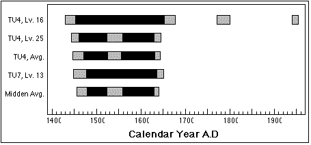 The excavation crew recovered several wood charcoal samples from most strata. All samples were taken from single objects (to avoid averaging results from several samples throughout an excavation unit), and sealed in plastic bags for shipping to Oregon. Dennis Griffin cleaned and dried samples for shipping to Beta-Analytic laboratories. I calibrated calendar dates using Beta Analytic’s calibrations, and the University of Washington’s CALIB computer program; both calibration methods use the 1993 Pretoria calibration curve for short-lived samples (Gillespie 1986; Stuiver, et al., 1993; Vogel, et al., 1993). I calculated all statistical tests using CALIB and Michael Miller's Probability Calculator program. Figure 2.4 summarizes the range of calibrated calendar dates from the TU4 and TU7 midden deposits.