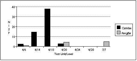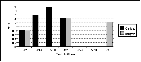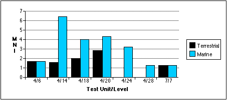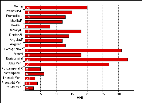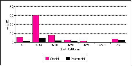 The next phase of analysis involved the determination of minimum number of individuals (MNI) for each taxonomic group identified above. Minimum numbers provide an estimate of the number of individuals represented in a sample. Using the presence of elements diagnostic of particular taxa—and making some consideration for size and age of the individuals at death—I could derive MNI for all identified taxonomic groups. Except in two instances (the TU4, Level 18 and Level 20 samples, and the Level 24 and Level 28 samples), I regarded each sample unit as discontinuous with other samples, so the MNI for any one species present in a given sample was figured separately from MNI for the same species in other samples.
