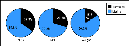 Several anatomical elements proved easier to identify and more information-rich than others. Following Wheeler and Jones (1989:150), I identified certain elements of fish skeletons that preserve well, are easily identified to species, and either occur singly or in pairs. Especially informative fish elements include heavy cranial bones along the medial line (and thus occurring once in a single fish). Some paired elements also proved informative, especially premaxillae, maxillae, and dentaries. Because of extraordinary preservation conditions at Nash Harbor, I could also distinguish elements, such as lightweight bones in the occipital and otic regions, that in other contexts are usually lost to taphonomic factors. Davis (1987:35) noted elements of mammal skeletons providing the same utility, including mandibles, bones of the shoulder and pelvic girdles, and limb and foot bones. The small size of the analyzed mammalian sample limited the number of these indicator bones, and the extent of the comparative collection meant that many bones, especially carpals and tarsals, remain unidentified. Bird remains proved the easiest to identify and often the best preserved. Bird leg, foot, and wing bones, and bones of the sternal and shoulder regions, were especially informative. Analyses at this stage produced number of individual specimens (NISP) data, which reflect the number of bone fragments identified to a particular taxon. In a few instances, I could refit broken bone fragments, but while these refits proved informative for generation of minimum number of indivual data (discussed below), I treated all fragments found at the time of analysis as individual specimens. In other words, if a single bone were found in two fragments, and I refitted those fragments, they still represented NISP = 2.