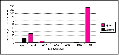 The stratigraphy of TU7 probably represents no more than two occupational episodes. In the first episode (Stratum III), Ellikarrmiut people probably performed some outdoor activity, probably shellfish or plant processing, directly on beach sands. Alternately, the area may have been a lightly-used trash area, not an activity site. The conjectured break between Substrata III-1 and III-2 may represent a brief hiatus of activity. In the second episode, Ellikarrmiut people deposited shellfish debris (Stratum II). Although a stable surface may bound the top of Stratum III, very little time may have elapsed between the deposition of Stratum III and Stratum II materials.