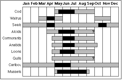 Drawing upon the archaeological and ethnohistoric evidence outlined above, I can characterize Ellikarrmiut, about 400 years ago, as a settlement with evidence for use in the spring and summer Figure 6.1. Cupiit practices of food storage make the differentiation of winter occupation more difficult; since summer foods were stored and consumed through the winter (Lantis 1946), the presence of animals believed to have been captured during the summer does not necessarily indicate a summer occupation. However, the presence of juvenile phocids in the analyzed sample is a strong indicator of late winter and early spring hunting by Nash Harbor residents. The evidence for cod processing also implicates summer occupation, a finding bolstered by the abundant mussel shell deposits recovered from the site. Since the Nunivarrmiut did not store mussels (Lantis 1946; VanStone 1989), mussel shell deposits from Nash Harbor indicate occupation during mussel season (May through August).