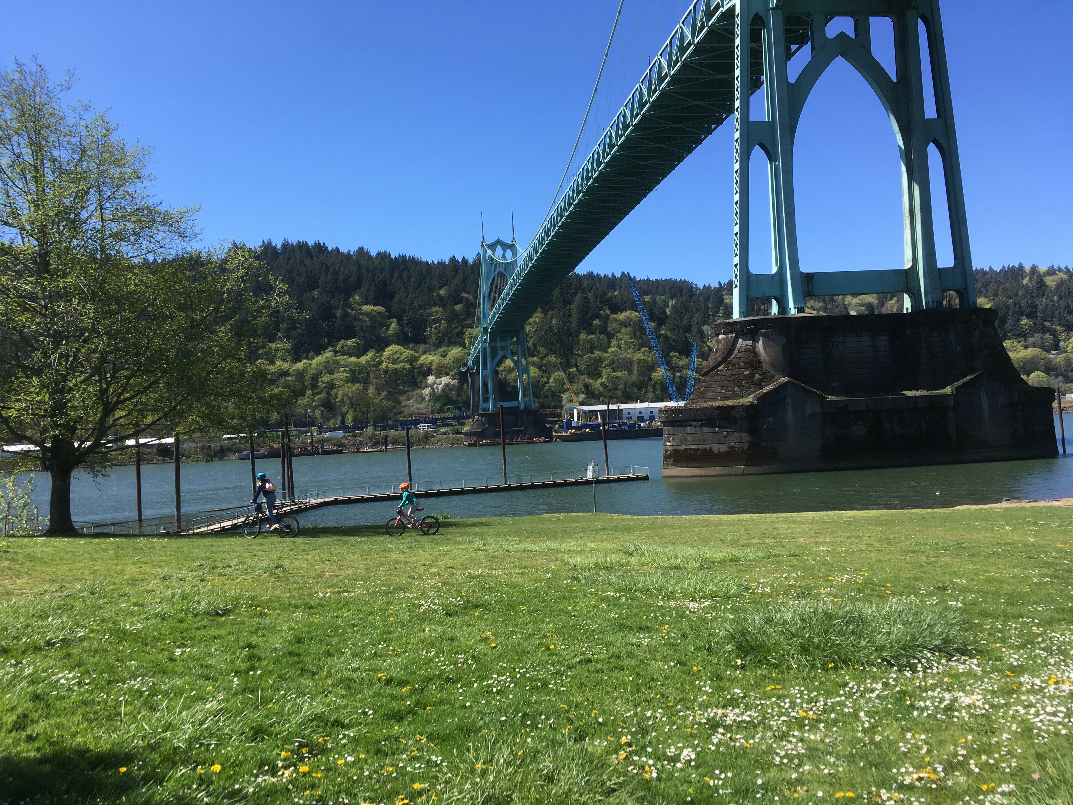 Today the kids and I rode 15mi (each way!) in the sparkling sunshine to North Portland in search of some of the sites in the movie. (Like most movies, it collapses space in unlikely ways, e.g. walking from Cathedral Park to U of Portland to Alberta Street). We couldn’t guess which of the Four water towers we saw was the one that had “Greetings Fellow Humans” written on it (probably via CGI)