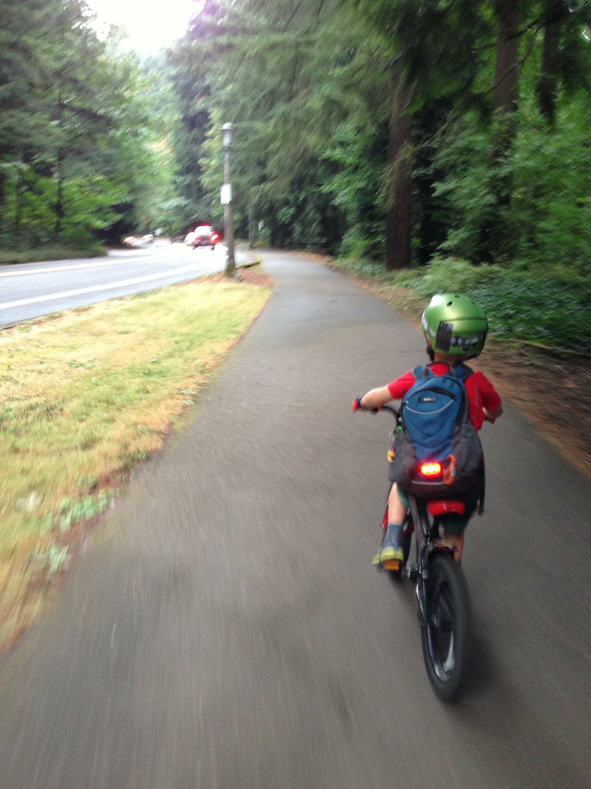 Orion rode between me and the curb, I took the lane where necessary, and as soon as we reached the MUP along Terwilliger, we rode on that the whole way in. Orion never betrayed a second of fear but I felt plenty for both of us.