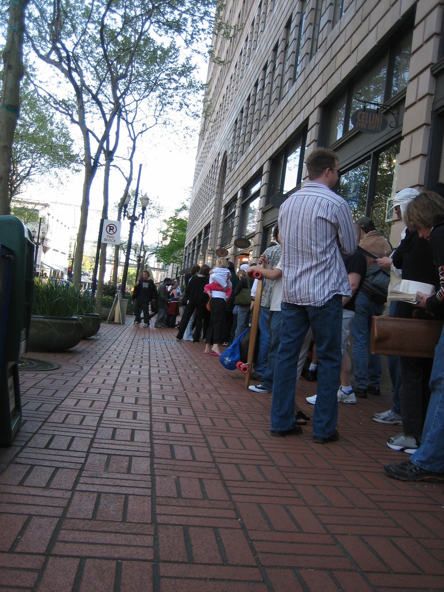...or rather, free ice cream. Today was "free ice cream" day at Ben and Jerry's, apparently a phenom of some sort. [sidebar: the local Ben and Jerry's is located on the first floor of the Pacific Building, where I work] People lined up around the corner, waiting up to an hour and half for a free ice cream cone.