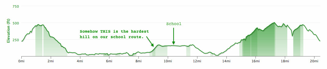 So on Fridays I work at home. When I chariot Orion (10mi) to school and then turn around and ride home again, my elevation profile looks something like this: