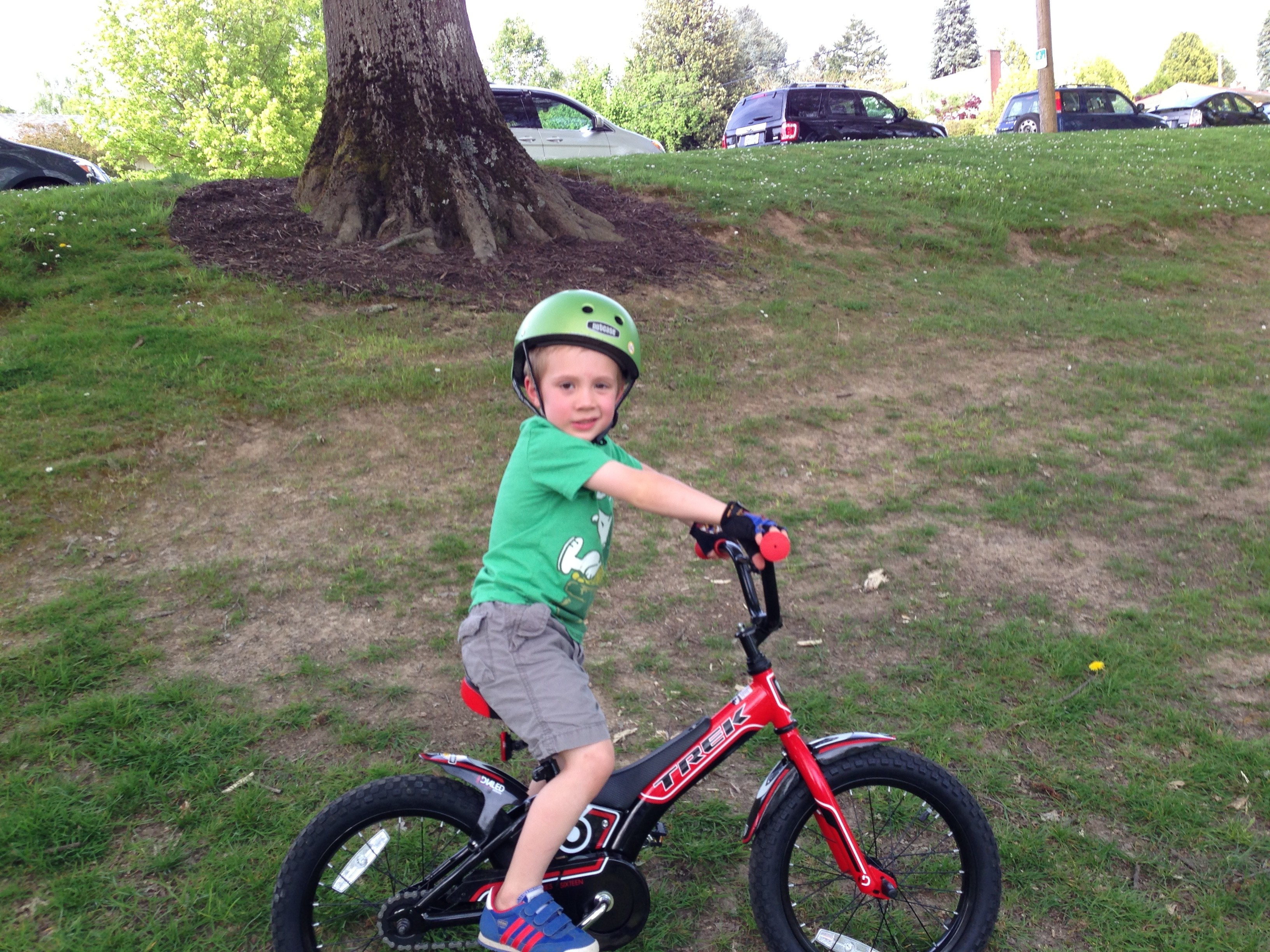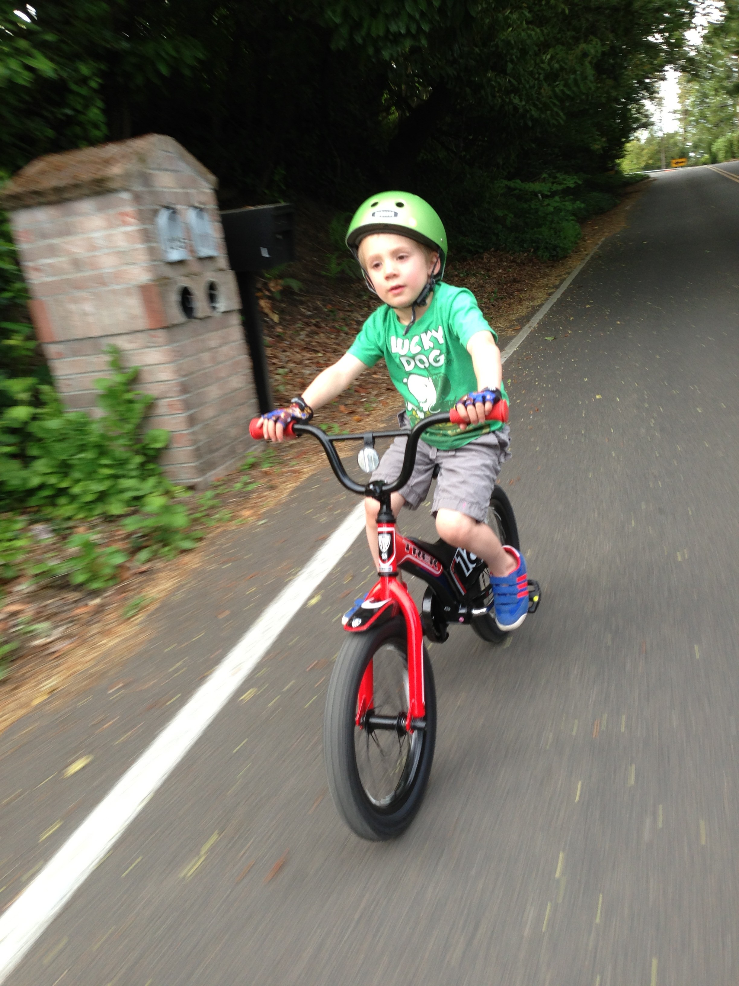 Orion (age 4.9) wanted to ride his new 16"-wheeler from Gabriel Park to our house (near Tryon Creek SP). It was not my idea. Jenny suggested it and Orion talked me into it.