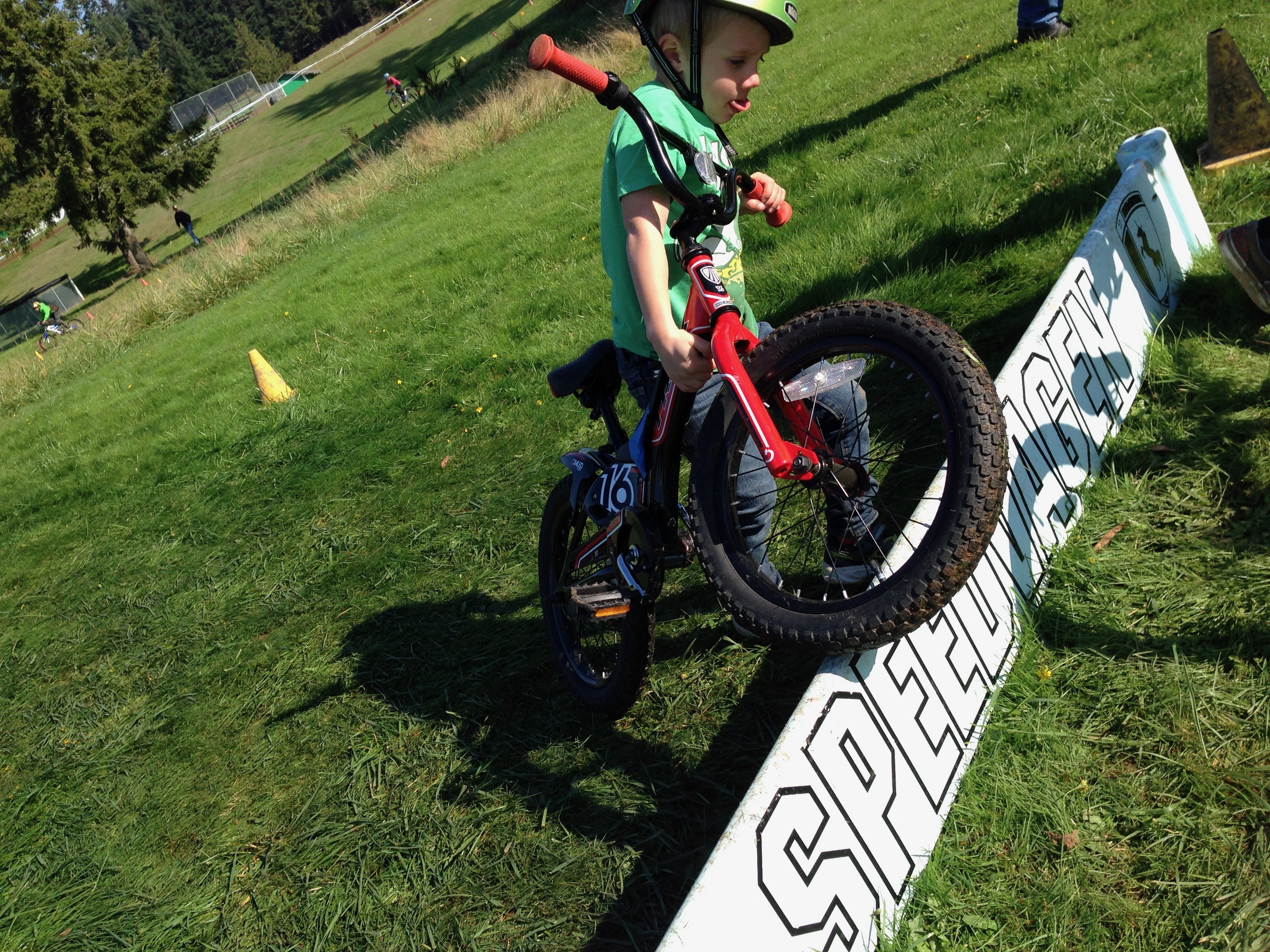 The Vanilla/Speedvagen crew are kind of extending the Kiddie Kross thing into a day-long rodeo with mini-events like “hot laps for 7 to 10 year olds.” This is brilliant. They had a surprisingly challenging rodeo course set up away from the main course. Between events the kids could just noodle around the rodeo. Iris rode a Kiddie A race on her pedal bike, with some assistance from Mom and Dad (like I said: the kiddie kourse was technical). Orion rode a “bell race,” a 15-minute timed event that played out surprisingly like a real ’cross race. He rode hard for 15 minutes, by the end his tongue was hanging out. I wonder where he gets that from?