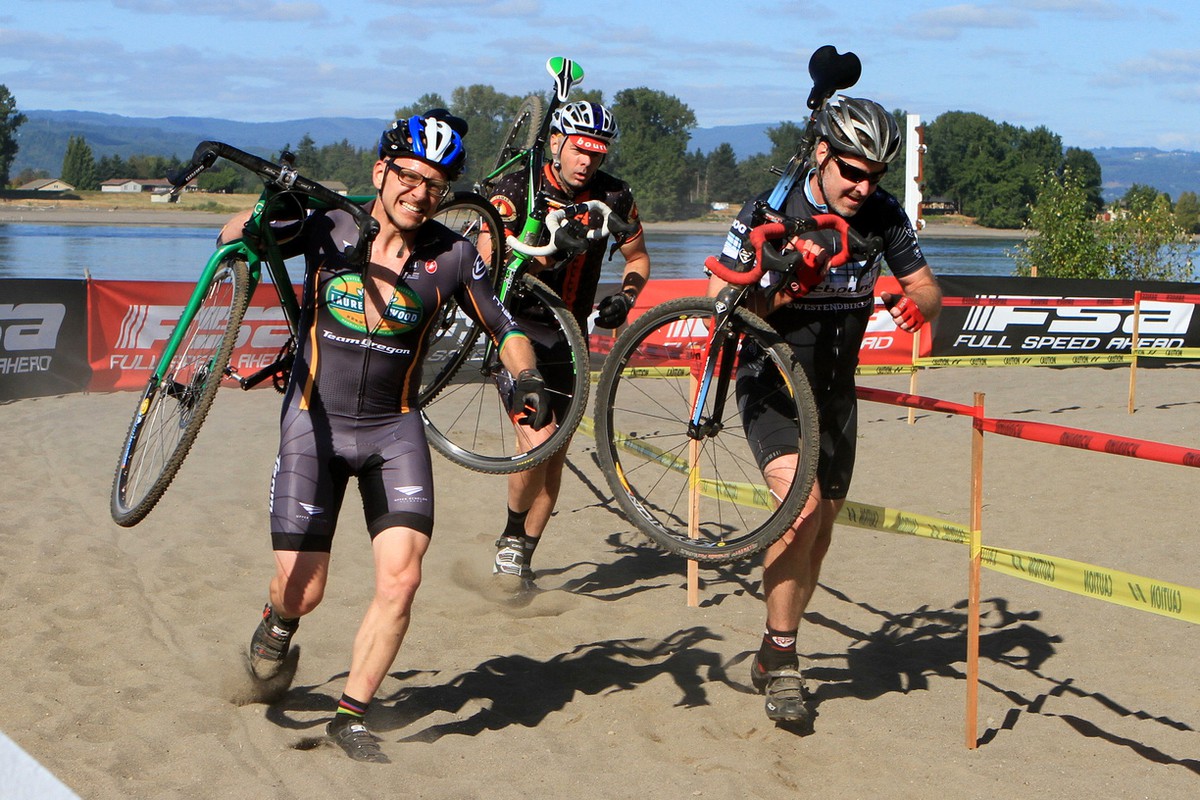 Good news: no crashes to speak of. I did drift over trying to ride up a runup on my last lap. (The crowd made me do it, chanting: “Ride. It! Ride. It!”) Turned my knee outward in that flop which lost me a few places, but by the last lap it barely mattered, the field had spread pretty badly.