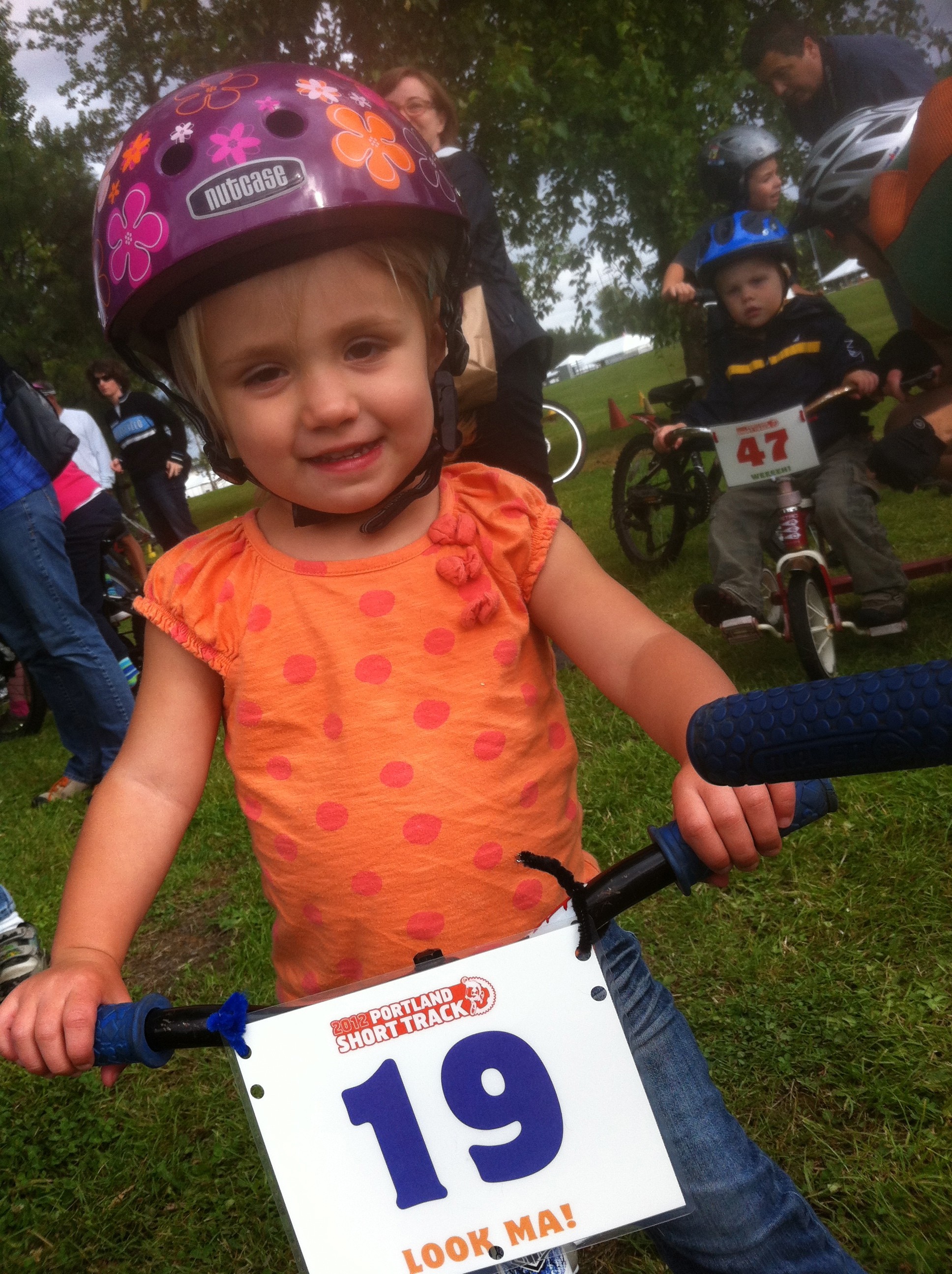 This was Iris’ “official” first race. She was psyched to get into her helmet and onto the bike. As soon as the pack started she declared “no thank you” and got off her bike and ran. Giggling the whole time.