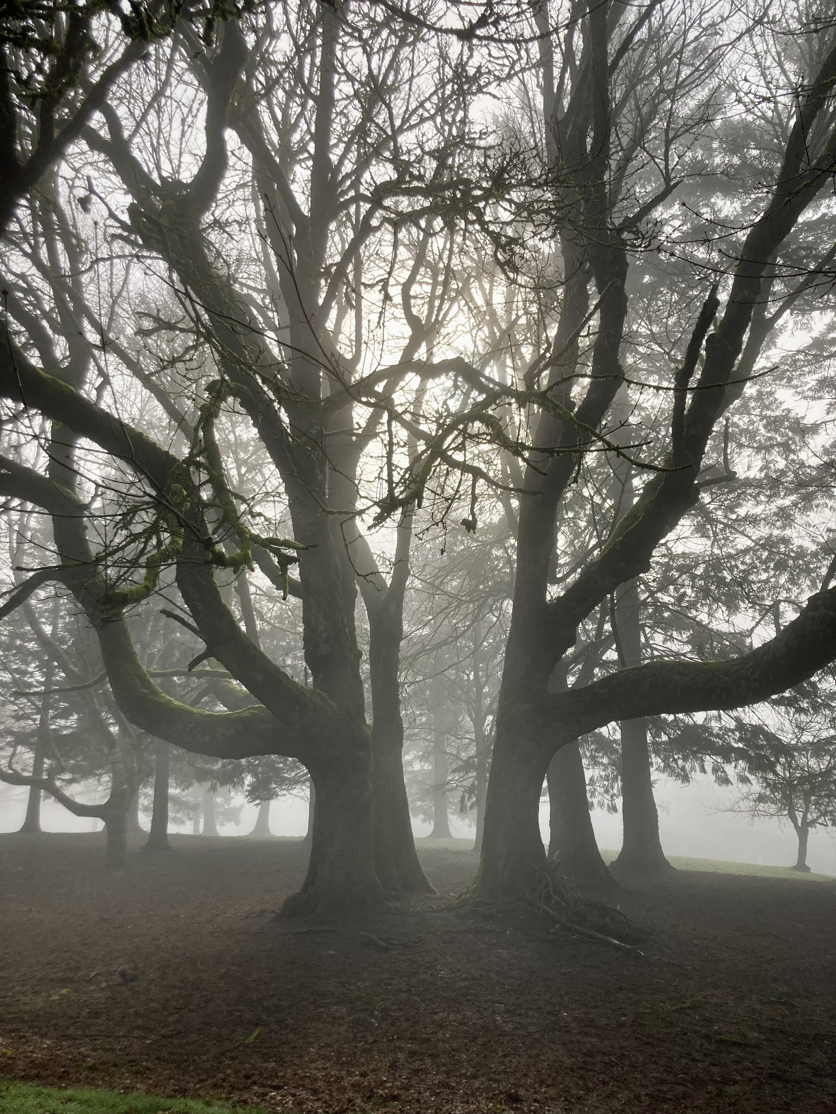 Three old trees in Council Crest Park with a void between them — probably where, in former days, a larger tree central once stood