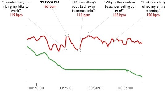 Interesting to note the fight-or-flight stuff going on here. The actual accident spiked my heartrate to 160+ bpm, but as soon as both the driver and I realized everyone was OK, and that no one was gonna be a jerk about it, my heartrate actually dropped below my usual commuting rate (around 125-130 bpm). But as soon as the crazy lady starting yelling at me my heartrate shot up almost to Zone 4.