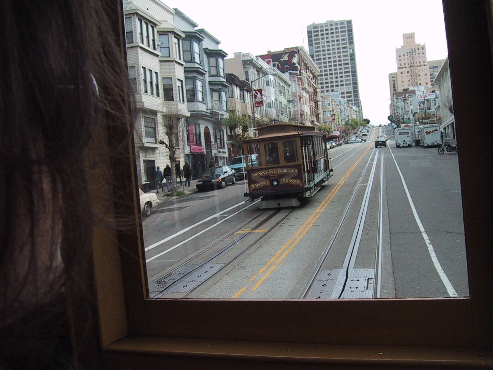 Shot out of the back of a cable car up a steep San Francisco Street; a woman’s face and hair is faintly visible in the near foreground looking out the window